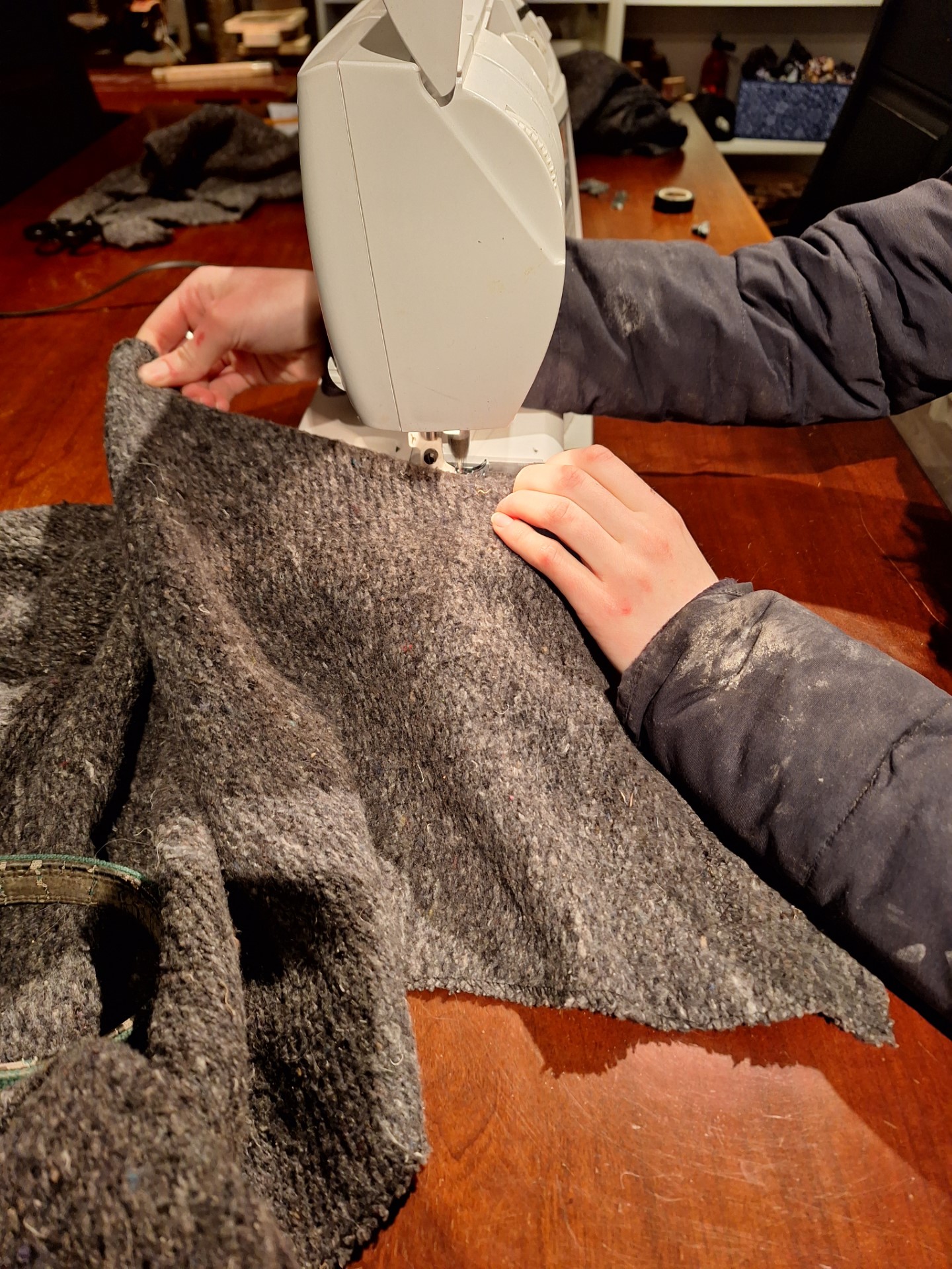 Formen ble klippet ut og sydd langs klippekanten. Det ble et ekstra lag oppå ryggen av restene fra teppet. De brukte litt lim for å holde delene sammen og som gjør syingen lettere.