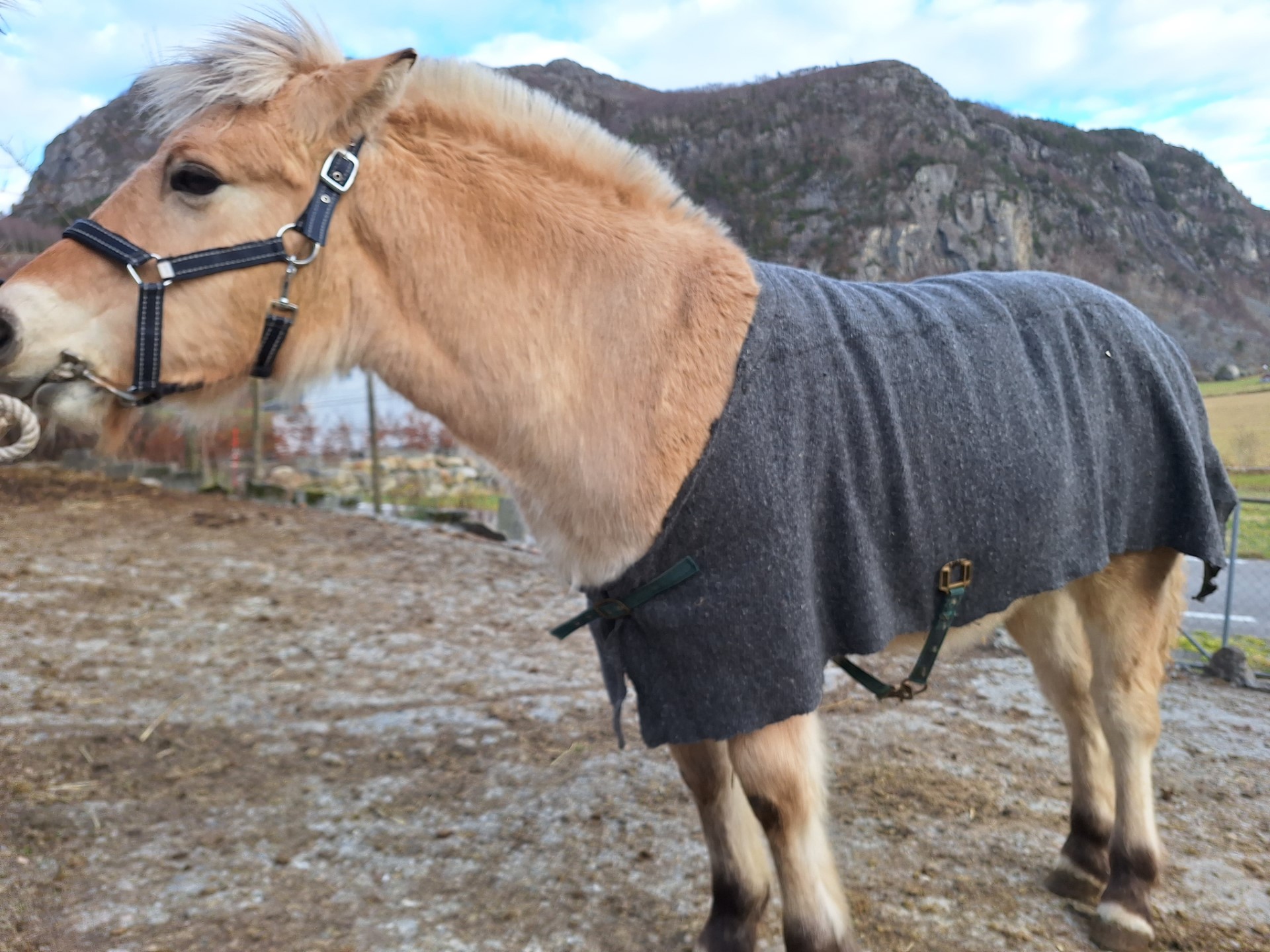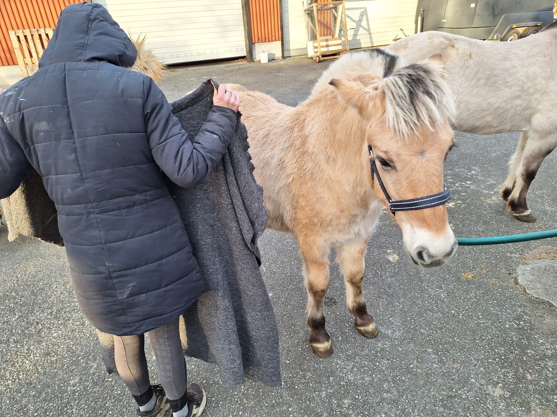 Plagget ble utprøvd underveis på føllet for å justere målene. Så ble hempene festet med lim, imens teppet var på føllet for å få det riktig plassert.